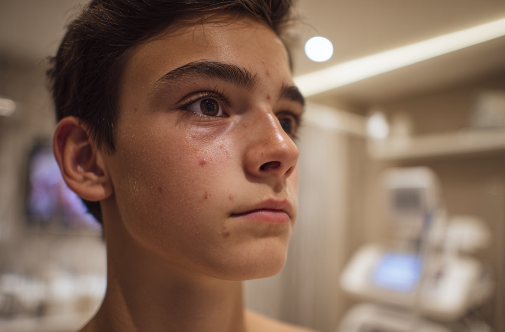 - Лечение Акне: Мы используем синий спектр света. Он убивает бактерии P. acnes глубоко в порах, стерилизуя кожу изнутри. Воспаления подсушиваются буквально за ночь.